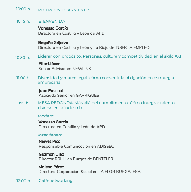 A través de una ponencia inspiradora con Pilar Llácer, experta en talento, y una mesa redonda con empresas referentes, se abordarán el marco legal vigente, buenas prácticas y experiencias reales de integración de talento diverso, con especial foco en la discapacidad como fuente de valor, innovación y sostenibilidad.